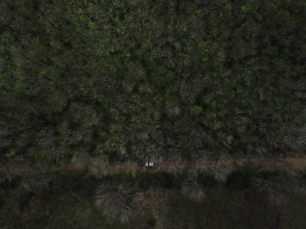 HD image from a drone flying over Santa Cruz island showing on the right: the agricultural land, and on the left: the buffer zone of the protected area of the Galapagos National Park (the road in the middle is the actual boundary between both zones). This area of the buffer zone invaded by Cedrela odorata, can be now spatialized to know its total extent and the conditions that allow its distribution. In a parallel fashion, we are mapping in the same island, regions dominated by native vegetation to perform similar quantitative analyses that will help for the managerial actions performed by the National Park. G. Rivas-Torres (copyright).